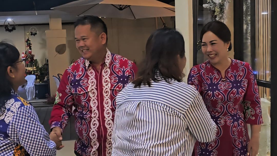 Sekda Malinau, Ernes Silvanus didampingi istri saat menyambut warga yang hadir diacara open house Natal 2025