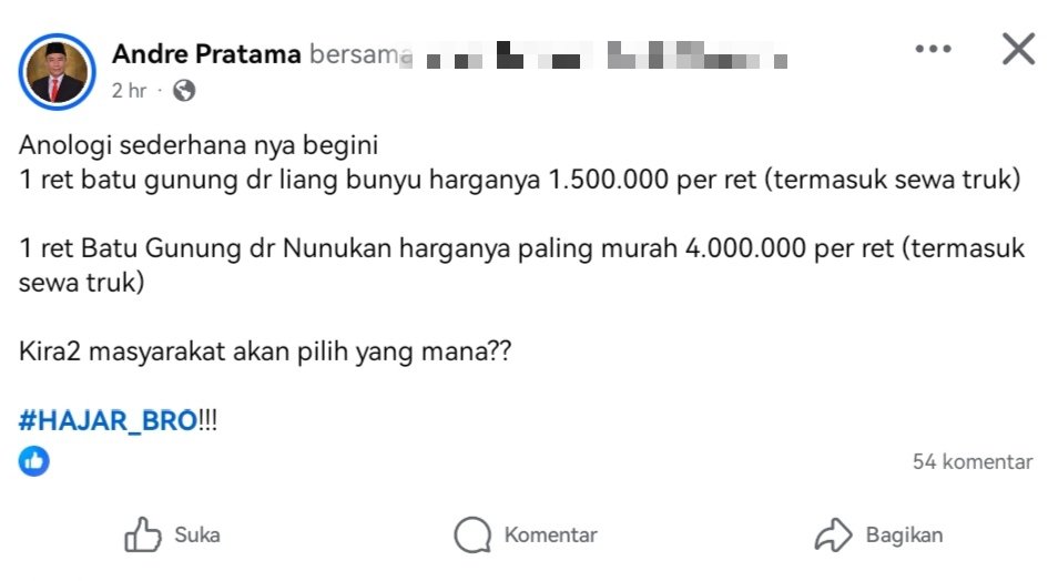 “Anologi sederhana nya begini, 1 ret batu gunung dr liang bunyu harganya 1.500.000 per ret (termasuk sewa truk), 1 ret Batu Gunung dr Nunukan harganya paling murah 4.000.000 per ret (termasuk sewa truk). Kira2 masyarakat akan pilih yang mana??,” tulis Andre melalui akun Facebook pribadinya.