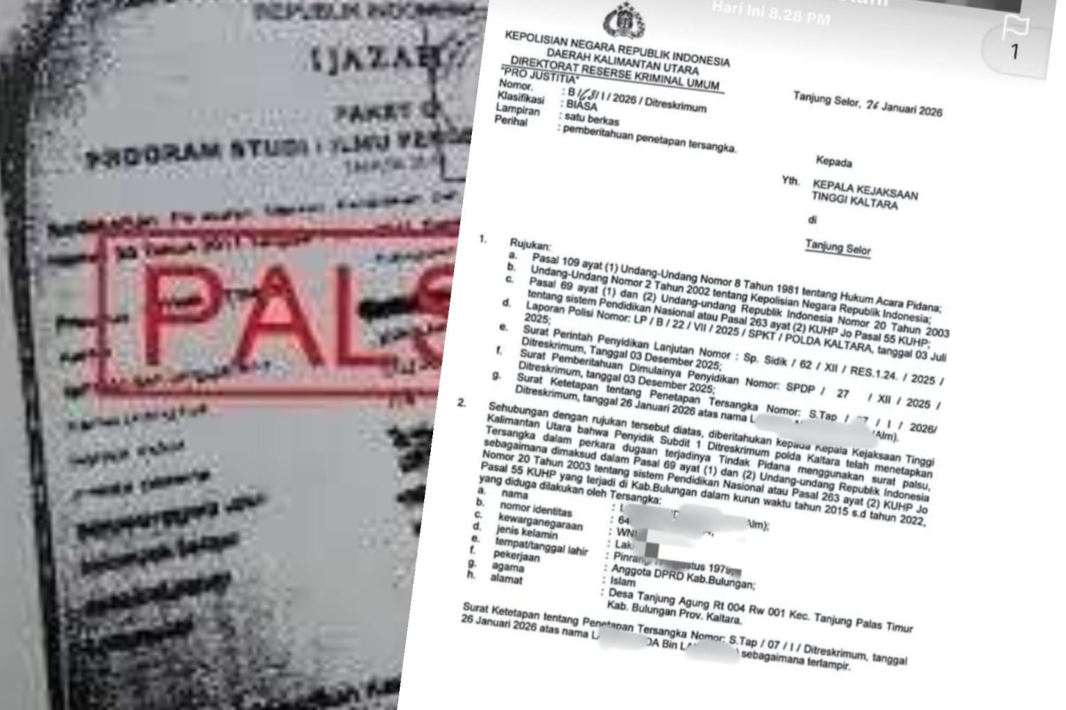 Direktorat Reserse Kriminal Umum (Ditreskrimum) Polda Kalimantan Utara menetapkan LL (46), anggota DPRD Bulungan aktif, sebagai tersangka kasus dugaan penggunaan ijazah palsu saat mendaftar sebagai calon legislatif pada Pemilu 2024.