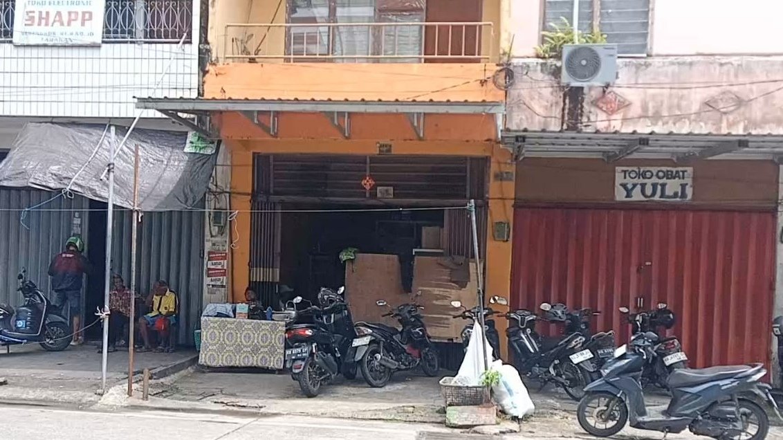 Salah satu warung kopi (warna oren) yang diduga menjadi tempat transaksi judi togel di pertigaan lampu merah Sebengkok